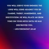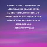 you will serve your enemies the LORD will send against you in famine, thirst, nakedness, and destitution. He will place an iron yoke on your neck until He has destroyed you.