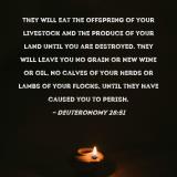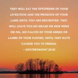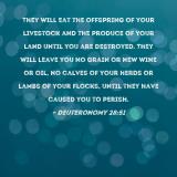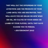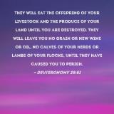 Pictures and Artwork They will eat the offspring of your livestock and the produce of your land until you are destroyed. They will leave you no grain or new wine or oil, no calves of your herds or lambs of your flocks, until they have caused you to perish. |