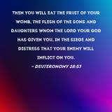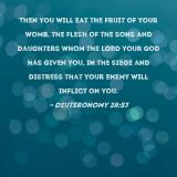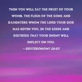 Then you will eat the fruit of your womb, the flesh of the sons and daughters whom the LORD your God has given you, in the siege and distress that your enemy will inflict on you.