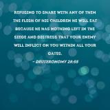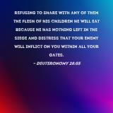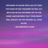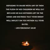 refusing to share with any of them the flesh of his children he will eat because he has nothing left in the siege and distress that your enemy will inflict on you within all your gates.