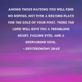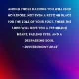 Among those nations you will find no repose, not even a resting place for the sole of your foot. There the LORD will give you a trembling heart, failing eyes, and a despairing soul.