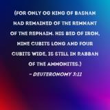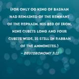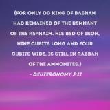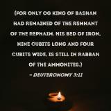 (For only Og king of Bashan had remained of the remnant of the Rephaim. His bed of iron, nine cubits long and four cubits wide, is still in Rabbah of the Ammonites.)
