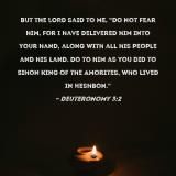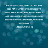 But the LORD said to me, "Do not fear him, for I have delivered him into your hand, along with all his people and his land. Do to him as you did to Sihon king of the Amorites, who lived in Heshbon."