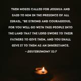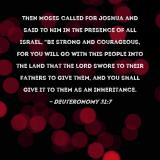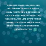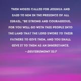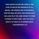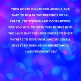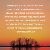 Pictures and Artwork Then Moses called for Joshua and said to him in the presence of all Israel, "Be strong and courageous, for you will go with this people into the land that the LORD swore to their fathers to give them, and you shall give it to them as an inheritance. |