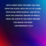 with curds from the herd and milk from the flock, with the fat of lambs, with rams from Bashan, and goats, with the choicest grains of wheat. From the juice of the finest grapes you drank the wine.