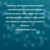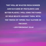 They will be wasted from hunger and ravaged by pestilence and bitter plague; I will send the fangs of wild beasts against them, with the venom of vipers that slither in the dust.