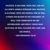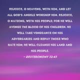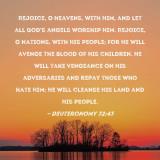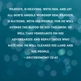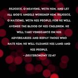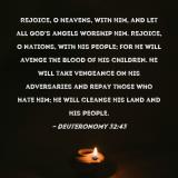 Pictures and Artwork Rejoice, O heavens, with Him, and let all God's angels worship Him. Rejoice, O nations, with His people; for He will avenge the blood of His children. He will take vengeance on His adversaries and repay those who hate Him; He will cleanse His land and His people. |