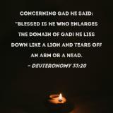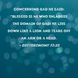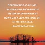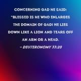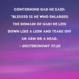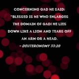 Concerning Gad he said: "Blessed is he who enlarges the domain of Gad! He lies down like a lion and tears off an arm or a head.