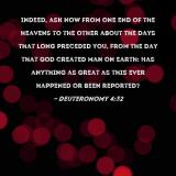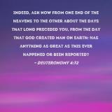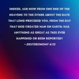 Indeed, ask now from one end of the heavens to the other about the days that long preceded you, from the day that God created man on earth: Has anything as great as this ever happened or been reported?