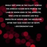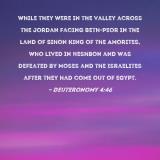 while they were in the valley across the Jordan facing Beth-peor in the land of Sihon king of the Amorites, who lived in Heshbon and was defeated by Moses and the Israelites after they had come out of Egypt.