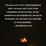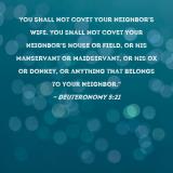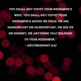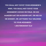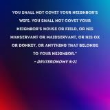 You shall not covet your neighbor's wife. You shall not covet your neighbor's house or field, or his manservant or maidservant, or his ox or donkey, or anything that belongs to your neighbor."