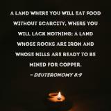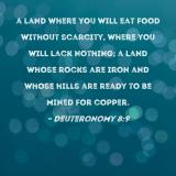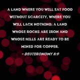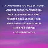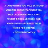 a land where you will eat food without scarcity, where you will lack nothing; a land whose rocks are iron and whose hills are ready to be mined for copper.