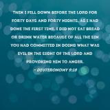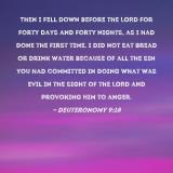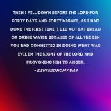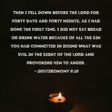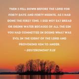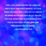 Pictures and Artwork Then I fell down before the LORD for forty days and forty nights, as I had done the first time. I did not eat bread or drink water because of all the sin you had committed in doing what was evil in the sight of the LORD and provoking Him to anger. |