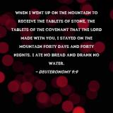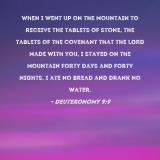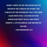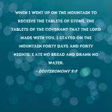 When I went up on the mountain to receive the tablets of stone, the tablets of the covenant that the LORD made with you, I stayed on the mountain forty days and forty nights. I ate no bread and drank no water.