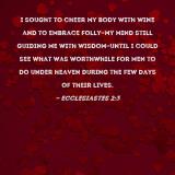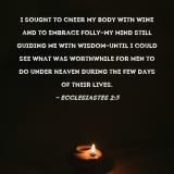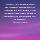I sought to cheer my body with wine and to embrace folly--my mind still guiding me with wisdom--until I could see what was worthwhile for men to do under heaven during the few days of their lives.