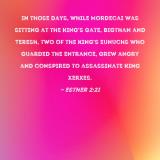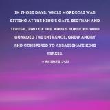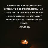 In those days, while Mordecai was sitting at the king's gate, Bigthan and Teresh, two of the king's eunuchs who guarded the entrance, grew angry and conspired to assassinate King Xerxes.