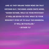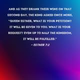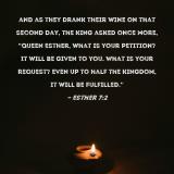 and as they drank their wine on that second day, the king asked once more, "Queen Esther, what is your petition? It will be given to you. What is your request? Even up to half the kingdom, it will be fulfilled."