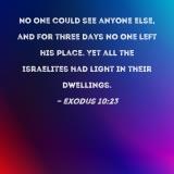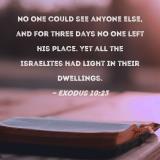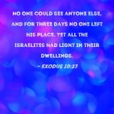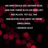 No one could see anyone else, and for three days no one left his place. Yet all the Israelites had light in their dwellings.