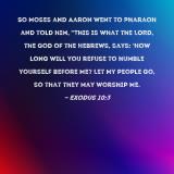 So Moses and Aaron went to Pharaoh and told him, "This is what the LORD, the God of the Hebrews, says: 'How long will you refuse to humble yourself before Me? Let My people go, so that they may worship Me.