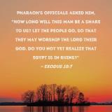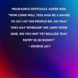 Pharaoh's officials asked him, "How long will this man be a snare to us? Let the people go, so that they may worship the LORD their God. Do you not yet realize that Egypt is in ruins?"
