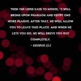 Then the LORD said to Moses, "I will bring upon Pharaoh and Egypt one more plague. After that, he will allow you to leave this place. And when he lets you go, he will drive you out completely.