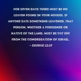 For seven days there must be no leaven found in your houses. If anyone eats something leavened, that person, whether a foreigner or native of the land, must be cut off from the congregation of Israel.