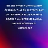 Tell the whole congregation of Israel that on the tenth day of this month each man must select a lamb for his family, one per household.