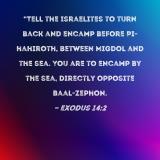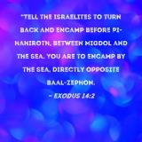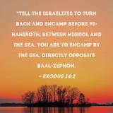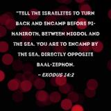 "Tell the Israelites to turn back and encamp before Pi-hahiroth, between Migdol and the sea. You are to encamp by the sea, directly opposite Baal-zephon.