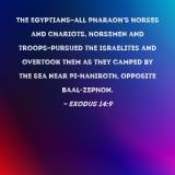 The Egyptians--all Pharaoh's horses and chariots, horsemen and troops--pursued the Israelites and overtook them as they camped by the sea near Pi-hahiroth, opposite Baal-zephon.