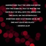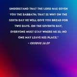 Understand that the LORD has given you the Sabbath; that is why on the sixth day He will give you bread for two days. On the seventh day, everyone must stay where he is; no one may leave his place."