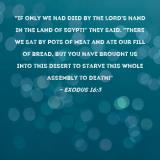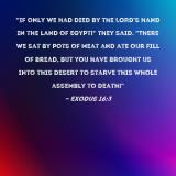 "If only we had died by the LORD's hand in the land of Egypt!" they said. "There we sat by pots of meat and ate our fill of bread, but you have brought us into this desert to starve this whole assembly to death!"