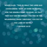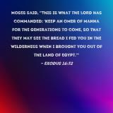 Moses said, "This is what the LORD has commanded: 'Keep an omer of manna for the generations to come, so that they may see the bread I fed you in the wilderness when I brought you out of the land of Egypt.'"