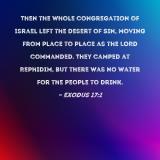 Then the whole congregation of Israel left the Desert of Sin, moving from place to place as the LORD commanded. They camped at Rephidim, but there was no water for the people to drink.