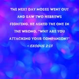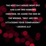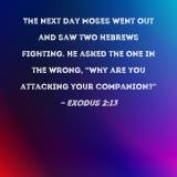 The next day Moses went out and saw two Hebrews fighting. He asked the one in the wrong, "Why are you attacking your companion?"