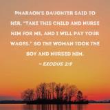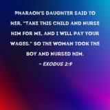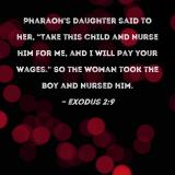 Pharaoh's daughter said to her, "Take this child and nurse him for me, and I will pay your wages." So the woman took the boy and nursed him.