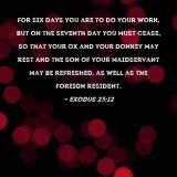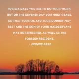 For six days you are to do your work, but on the seventh day you must cease, so that your ox and your donkey may rest and the son of your maidservant may be refreshed, as well as the foreign resident.