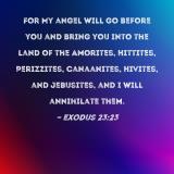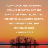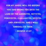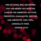 For My angel will go before you and bring you into the land of the Amorites, Hittites, Perizzites, Canaanites, Hivites, and Jebusites, and I will annihilate them.