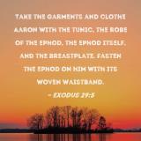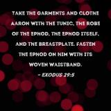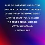 Take the garments and clothe Aaron with the tunic, the robe of the ephod, the ephod itself, and the breastplate. Fasten the ephod on him with its woven waistband.