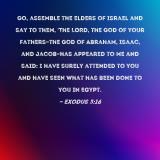 Pictures and Artwork Go, assemble the elders of Israel and say to them, 'The LORD, the God of your fathers--the God of Abraham, Isaac, and Jacob--has appeared to me and said: I have surely attended to you and have seen what has been done to you in Egypt. |