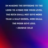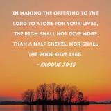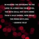 In making the offering to the LORD to atone for your lives, the rich shall not give more than a half shekel, nor shall the poor give less.