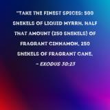 "Take the finest spices: 500 shekels of liquid myrrh, half that amount (250 shekels) of fragrant cinnamon, 250 shekels of fragrant cane,