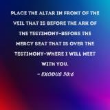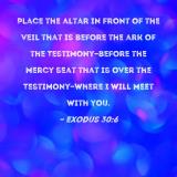 Place the altar in front of the veil that is before the ark of the Testimony--before the mercy seat that is over the Testimony--where I will meet with you.