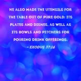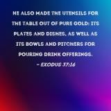 He also made the utensils for the table out of pure gold: its plates and dishes, as well as its bowls and pitchers for pouring drink offerings.