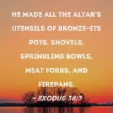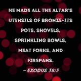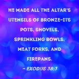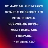 He made all the altar's utensils of bronze--its pots, shovels, sprinkling bowls, meat forks, and firepans.
