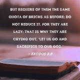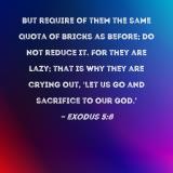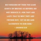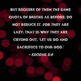 But require of them the same quota of bricks as before; do not reduce it. For they are lazy; that is why they are crying out, 'Let us go and sacrifice to our God.'