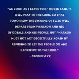 Pictures and Artwork "As soon as I leave you," Moses said, "I will pray to the LORD, so that tomorrow the swarms of flies will depart from Pharaoh and his officials and his people. But Pharaoh must not act deceitfully again by refusing to let the people go and sacrifice to the LORD." |