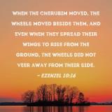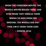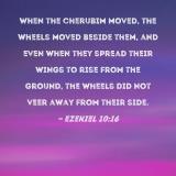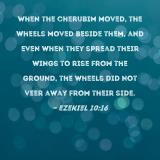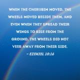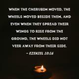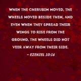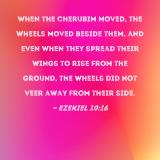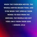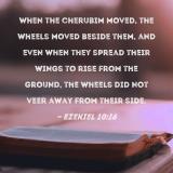 When the cherubim moved, the wheels moved beside them, and even when they spread their wings to rise from the ground, the wheels did not veer away from their side.