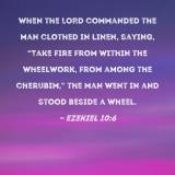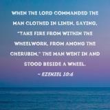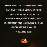 When the LORD commanded the man clothed in linen, saying, "Take fire from within the wheelwork, from among the cherubim," the man went in and stood beside a wheel.
