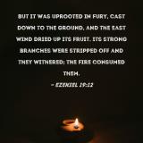 But it was uprooted in fury, cast down to the ground, and the east wind dried up its fruit. Its strong branches were stripped off and they withered; the fire consumed them.