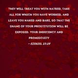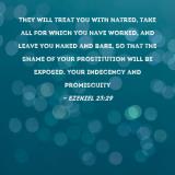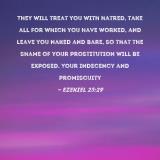 They will treat you with hatred, take all for which you have worked, and leave you naked and bare, so that the shame of your prostitution will be exposed. Your indecency and promiscuity